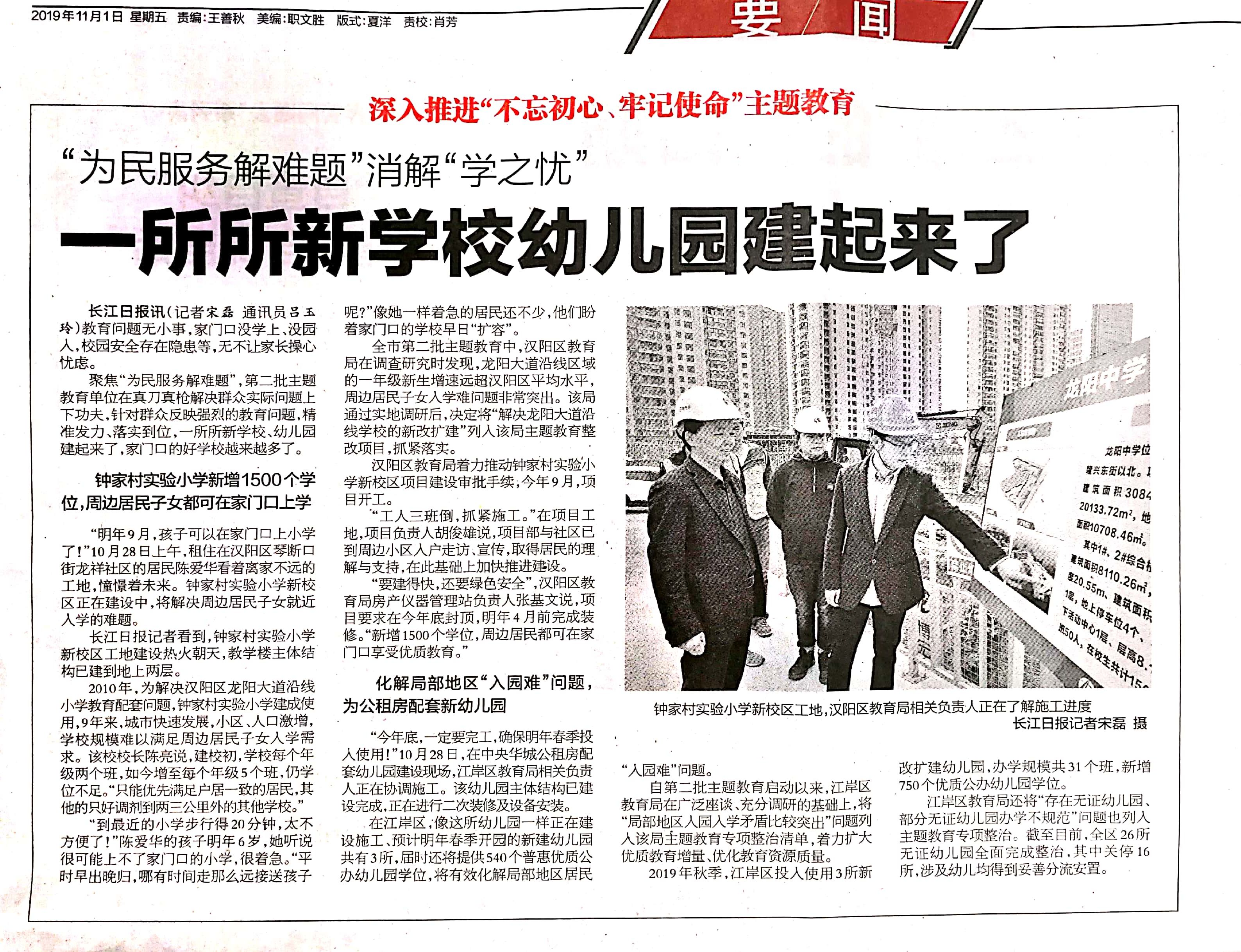 ?????????111日,《長(zhǎng)江日?qǐng)?bào)》以“‘為民服務(wù)解難題’消解‘學(xué)之憂’—一所所新學(xué)校幼兒園建起來(lái)了”為題,專題報(bào)道了龍陽(yáng)中學(xué)項(xiàng)目(該項(xiàng)目建成后35年將作為鐘家村實(shí)驗(yàn)小學(xué)新校區(qū)使用)的在建情況和建設(shè)意義。