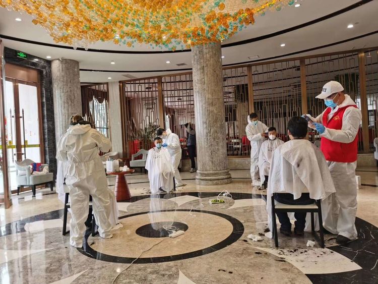 目前正值疫情防控決戰(zhàn)階段,為了確保整個(gè)理發(fā)過(guò)程安全有序,此次理發(fā)活動(dòng)選在公司防疫項(xiàng)目建設(shè)人員集中居住的紐賓凱大酒店,志愿者們均由公司指派專人開(kāi)車(chē)提前1個(gè)小時(shí)從漢陽(yáng)、漢口接至酒店,進(jìn)入大堂之前,所有人員均進(jìn)行了體溫檢測(cè),并分發(fā)口罩,理發(fā)開(kāi)始后則按照每四人一組進(jìn)行輪換理發(fā),避免人員集中。整個(gè)理發(fā)過(guò)程持續(xù)了近4個(gè)小時(shí),在4位理發(fā)師的精心打理下,70余名項(xiàng)目一線人員從“油膩大叔”秒變“帥氣小伙”。