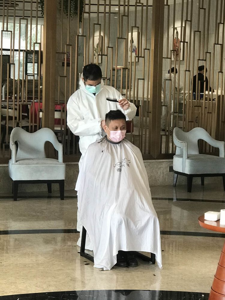 “麻煩幫我剪短點(diǎn),再剪短點(diǎn),兩個(gè)月沒(méi)理過(guò)發(fā)了,頭發(fā)從來(lái)沒(méi)這么長(zhǎng)過(guò)!”3月8日上午10點(diǎn),搬來(lái)幾張椅子、拿上幾把剪發(fā)器,“臨時(shí)理發(fā)店”在紐賓凱酒店大堂正式開(kāi)業(yè)。