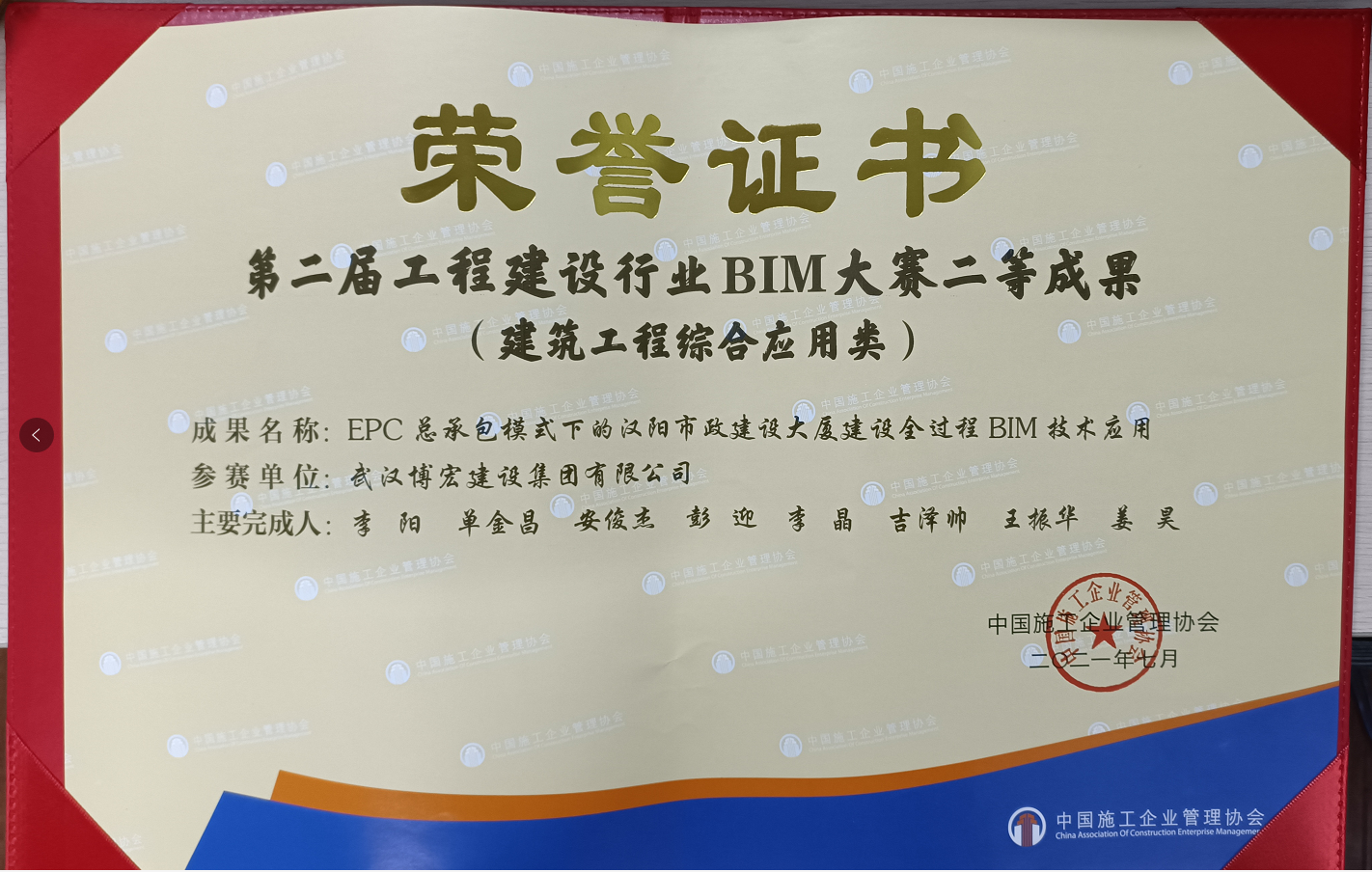 10月8日,博宏建設(shè)捧回“第二屆”全國(guó)工程行業(yè)BIM大賽獎(jiǎng)杯,此次BIM大賽為全國(guó)性性質(zhì)比賽,由中國(guó)施工企業(yè)管理協(xié)會(huì)主辦,公司參賽作品“EPC總承包模式下的漢陽(yáng)市政建設(shè)大廈建設(shè)全過(guò)程BIM技術(shù)應(yīng)用”在2275個(gè)作品中脫穎,獲得二等獎(jiǎng)的優(yōu)異成績(jī)。