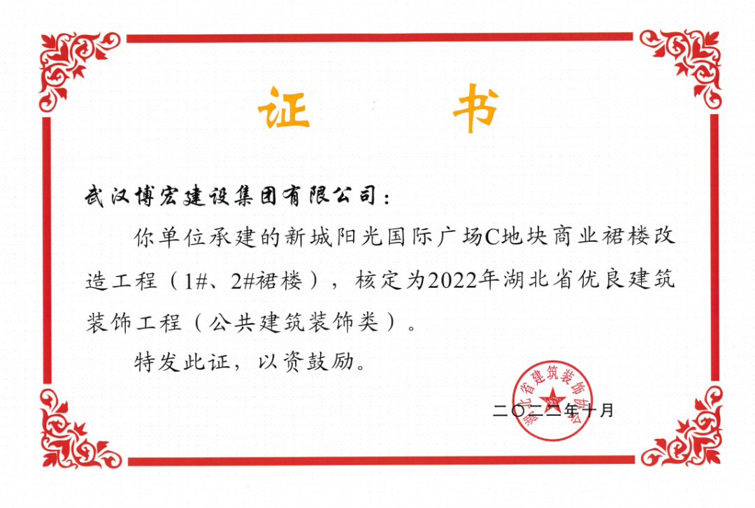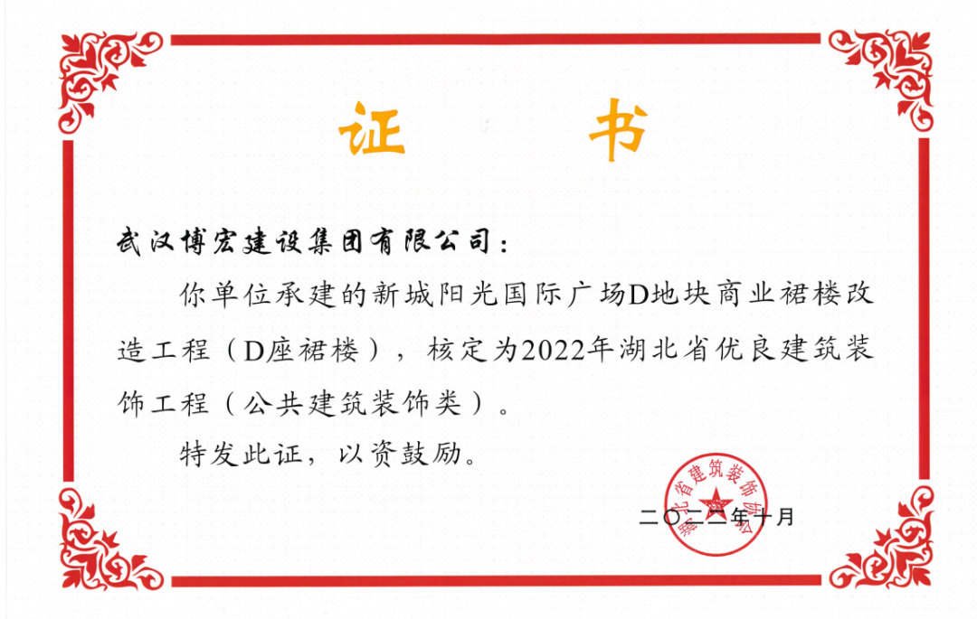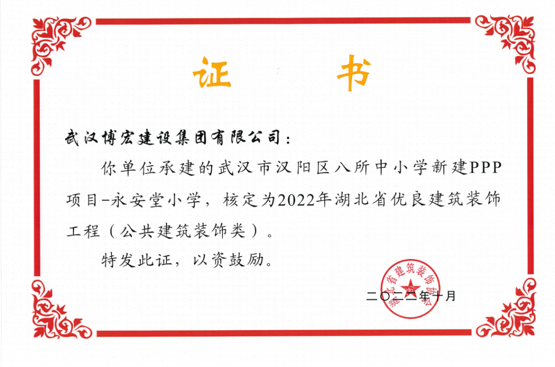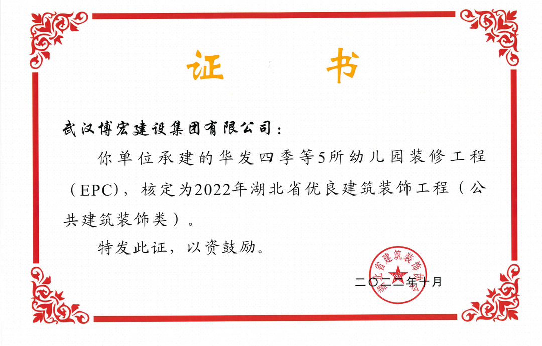 近日,湖北省建筑裝飾協(xié)會發(fā)布了《關(guān)于開展2022年湖北省建筑裝飾工程質(zhì)量目標(biāo)考核工作的通知》,由博宏建設(shè)集團(tuán)承建的華發(fā)四季等5所幼兒園裝修工程(EPC)、新城陽光國際廣場C地塊商業(yè)裙樓改造工程(1#、2#裙樓)、新城陽光國際廣場D地塊商業(yè)裙樓改造工程(D座裙樓)、武漢市漢陽區(qū)八所中小學(xué)新建PPP項目-永安堂小學(xué)被核定為“2022年湖北省優(yōu)良建筑裝飾工程(公共建筑裝飾類)”。