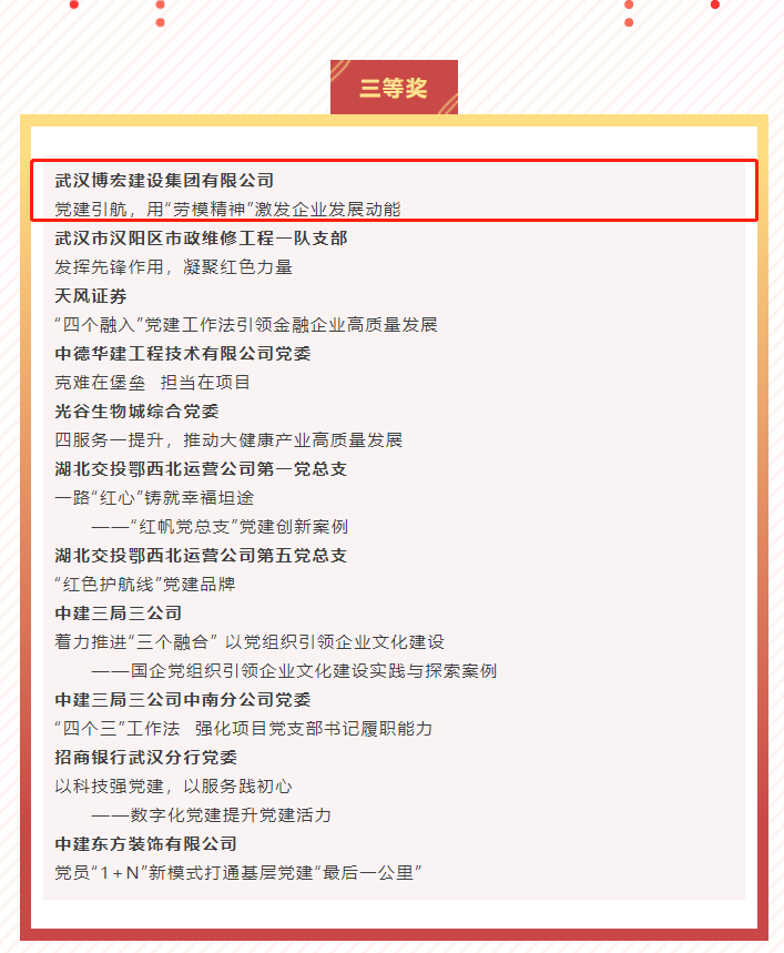 ? ? ? ?近日,首屆新時代企業(yè)黨建創(chuàng)新案例獲獎名單公布,由博宏建設集團推送的《黨建引航,用“勞模精神”激發(fā)企業(yè)發(fā)展動能》品牌案例斬獲黨建優(yōu)秀案例三等獎。?該項活動由湖北省新時代文明實踐研究院、華中科技大學馬克思主義學院、華中科技大學黨的建設研究中心聯(lián)合紅艦智庫等機構(gòu)共同發(fā)起,博宏建設集團推送的品牌案例在百余項案例中脫穎而出。