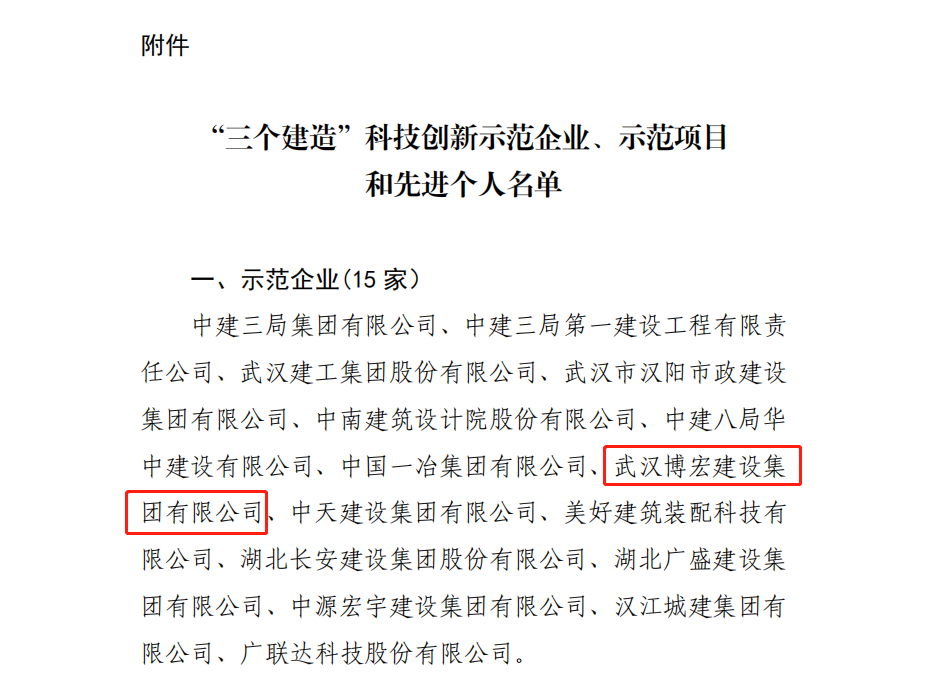 12月28日湖北省住房和城鄉(xiāng)建設(shè)廳發(fā)布關(guān)于綠色建造智能建造品質(zhì)建造科技創(chuàng)新工作情況的通報(bào),博宏建設(shè)集團(tuán)入選“三個(gè)建造”科技創(chuàng)新示范企業(yè);漢陽(yáng)市政建設(shè)大廈(一標(biāo)段)、新建商務(wù)服務(wù)與設(shè)施項(xiàng)目(中南科研設(shè)計(jì)中心)項(xiàng)目入選“三個(gè)建造”科技創(chuàng)新示范項(xiàng)目;嚴(yán)俊、楊云華入選“三個(gè)建造”科技創(chuàng)新先進(jìn)個(gè)人。