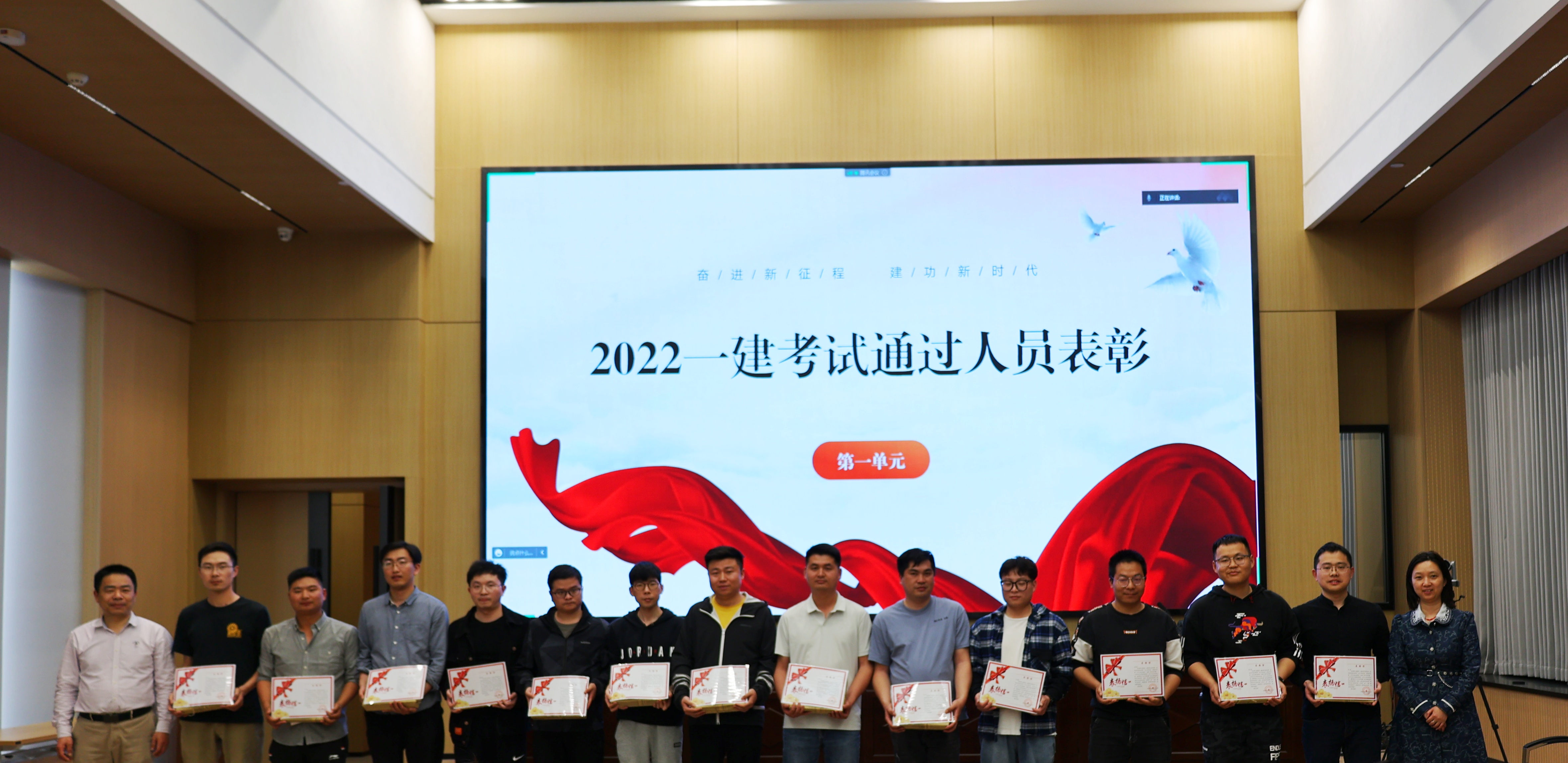 黨委副書記郭一清和本次合作培訓機構講師——鑫凌眾教育資深名師甘恢義老師為2022年度16名通過一建考試的學員頒發(fā)榮譽獎品和表揚信。