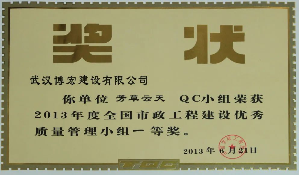 芳草云天QC小組成立于2011年5月31日,本小組從企業(yè)經(jīng)營戰(zhàn)略、方針目標和現(xiàn)場存在的問題出發(fā),以提高效能、降低消耗、實現(xiàn)經(jīng)濟與社會效益雙贏為目的,全面優(yōu)化項目質(zhì)量。歷年來追求卓越、探索新品,曾獲得2013 年全國市政工程建設協(xié)會優(yōu)秀QC成果一等獎、2014年湖北省市政工程建設優(yōu)秀QC成果二等獎、2015年湖北省市政工程建設優(yōu)秀 QC成果一等獎、2022年度中國施工企業(yè)管理協(xié)會工程建設質(zhì)量管理小組活動成果二等獎、2022年中國建筑業(yè)工程建設質(zhì)量管理小組活動成果三等獎等榮譽。