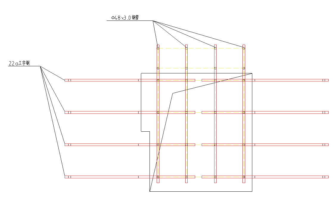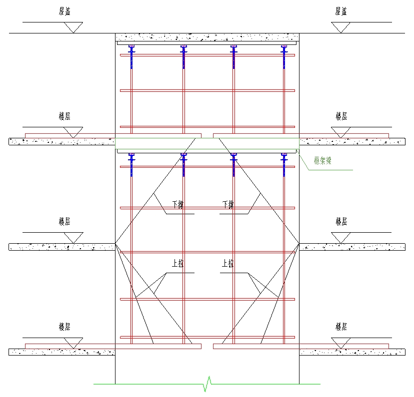 該技術通過采用兩道16#工字鋼懸挑(一道布置在屋面層,一道布置在屋面層-2層),分別設置下?lián)渭吧侠姆绞酱钤O支撐平臺,再利用此平臺為基礎搭設支撐架和外腳手架,既用于結(jié)構施工,同時兼作安全防護,有效降低了操作人員的安全風險,對結(jié)構安全性有較大保障。